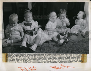 Cleveland, Ohio- The mothers of these six solid citizens thought that it is going to be a good idea to bring them all together on their first birthday. (left to right) Jack Miker, Tommy Lloyd, Edward D'Alessandro, Mary Jane Tabor, the hostess, Janice Stamp and Terry Scanlon.