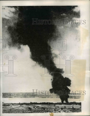 1943 Press Photo Two Oil Tanks of Yethaya Refinery in Burma Burn From Attack