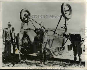 1932 Press Photo Pilot William Campbell attempting to land flipped over plane