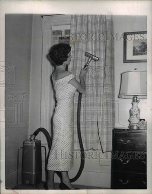 1953 Press Photo The regular vacuum cleaning of curtains - nee24821