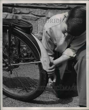 1951 Press Photo Boy Checks Bike for Light and Tail Reflector