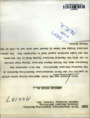Anita Jockers was the first American typing speed artist to qualify for the third annual marathon at the Canadian National Exhibition. She will represent San Francisco when the United States National Typing Team battles the Canadian National Typing Team in the two-week, day and night marathon August 22nd to September 6th. The International Trophy was taken by Canada last year and in 1939 by the United States.