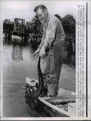 1957 Press Photo Sgt. Reubin Hudgins pulled in 3 foot alligator - nee29561
