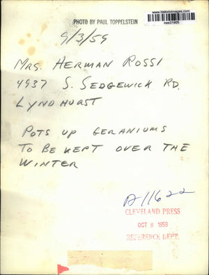 1959 Press Photo Mrs.Herman Rossi pots up geraniums to be kept for winter