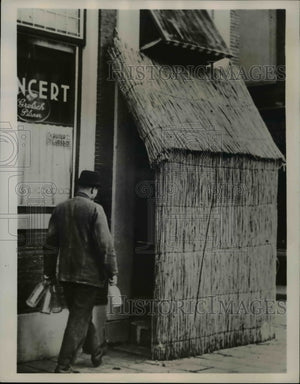 1940 Press Photo Inn Keeper in Holland Rigs Door Shield Blocks Out Light at Nigh