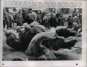 1957 Press Photo Santa Claus Statue Lays on Sidewalk, New York - nee36671