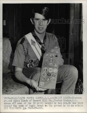 1970 Press Photo James Clark show off some of the merit badges he has won