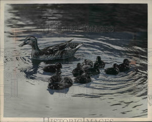 1953 Press Photo Mallard Duck Mother & Ducklings Swimming, Cleveland Wade Park