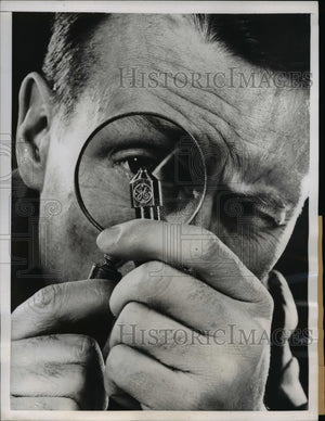 1955 Press Photo Dr. H. Tracy Hall Looks Diamond-Tipped Tool w Magnifying Glass
