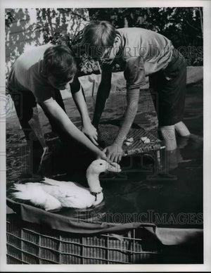 1968 Press Photo Boys Petting Duck in Swimming Pool - nee45669
