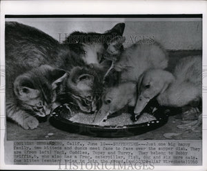 1960 Press Photo of kittens and ducks eating out of the same bowl. - nee47663