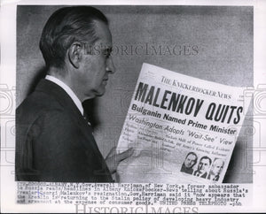 Gov. Averell Harriman reads Russia Premier Georgi Malenkov's resignation.