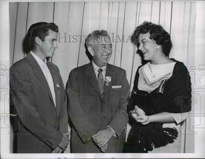 Youngest delegate to the Illinois AFL convention is Richard Nelson, left, 21, Crystal Lake, Illinois, recording secretary, Carpenters Union Local 2087. Young Nelson was accompanied by his bride, Barbara, 17, right, currently a senior in high school at Crystal Lake. Roy F. Cummins, center, Chicago, Director of Labor, State of Illinois, also attends session during final day of convention. The group is trying to effect merger with State CIO.