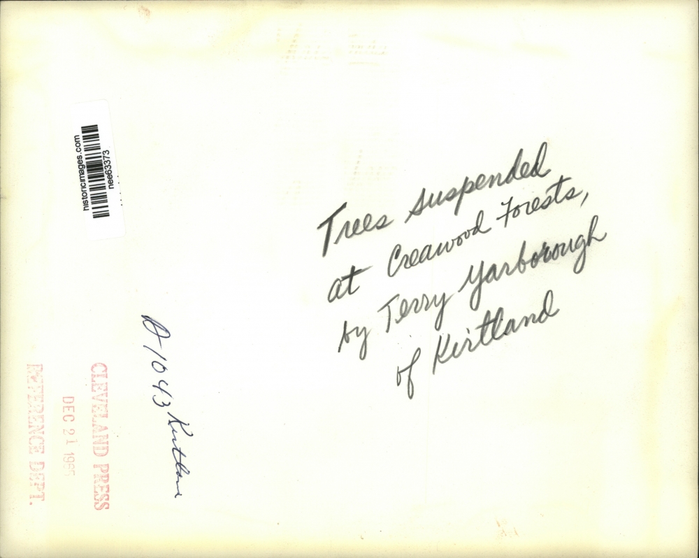 1965 Press Photo Christmas Trees Suspended from Ropes at Creawood Forest, Ohio