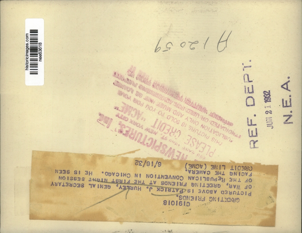 1932 Press Photo Patrick J Hurley, Sec. of War greets friends at convention.