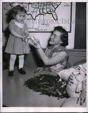 1953 Press Photo Loraine Stevens, Presents Pennies Donnah Behn million penny