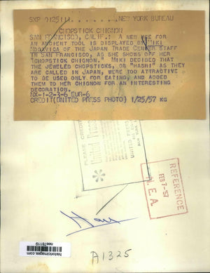 1957 Press Photo Hairstyle Using Jeweled Chopsticks Worn by Miki Nogavica