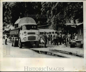 1969 Press Photo Armed Soldiers stan guard as refuguees line for food.
