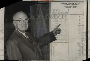 Former President Harry Truman points to list of candidates on side of voting booth.