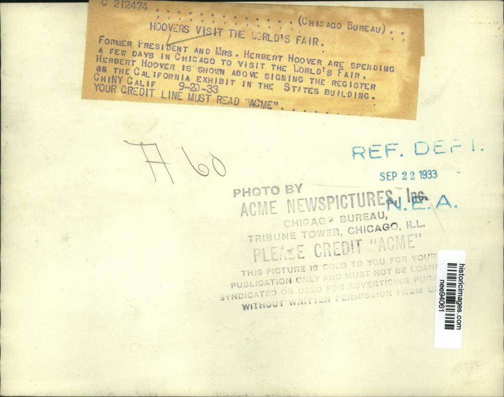1933 Press Photo Pres.Herbert Hoover signs register on California Exhibit