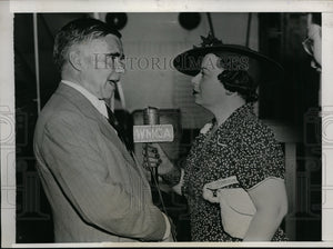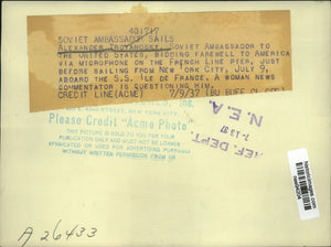 Soviet Ambassador to the US Alexander Troyanosky bids farewell to the US via microphone on the French line pier before sailing on the SS Ile De France.