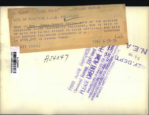 Mrs James Monroe Smith wife of missing LSU President said to be with him as he flees police who seek his capture following discovery of a shortage in school funds.