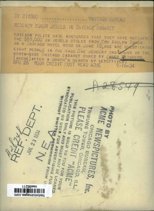 Chicago Stolen jewel $65,000 from Mrs.Adolph Zukor in a Chicago Hotel found in the North side Chicago cabaret owned by James Weinberg