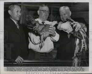 1955 Press Photo Defense Sec.C.E Wilson received gift from Japan-Yokohoma