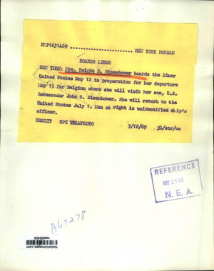 For her departure for Belgium where she will visit he son U.S Amb. John S.. Eisenhower