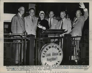 Senator Frank Carlson, Arthur Summerfield, Mamie Eisenhower, Senator Fred Seaton, General Sherman Adams, and General Eisenhower smile for cameras before Eisenhower leaves on tour.