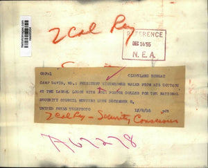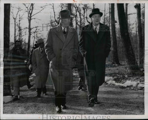 President Eisenhower walks from his cottage in Camp David, MD, with John Foster Dulles for the National Security Council meeting.
