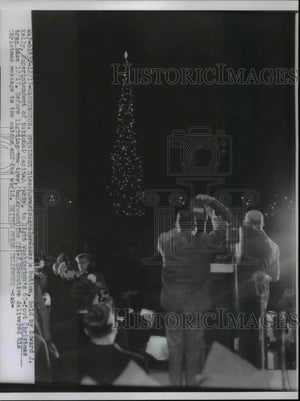 President Eisenhower presses a button held by Edward J. Kelly, Superintendent of National Capital Parks to light Washington's 67-foot Christmas tree.