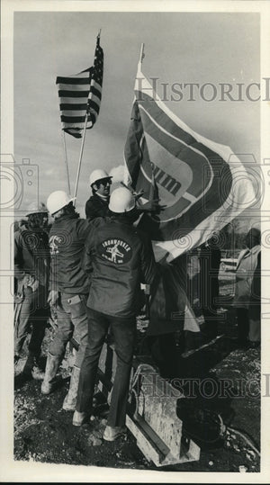 1973 Press Photo Flags Being Raised by Iron Workers - nef43848
