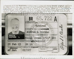 1955 Press Photo Identification card of Alfred L. Beatie, USAF, retired, CA