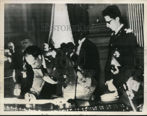 1951 Press Photo King Leopold of Belgium Signs Abdication Papers in Trone Room
