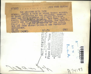 1951 Press Photo Pair of Sendai Misses Attracted by Uniforms & Headgear