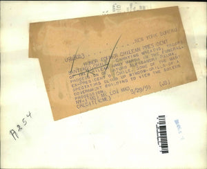 Carrying wreaths, troops of the Chilean Army march in the funeral procession of Arturo Alessandris Palma, Ex-President of Chile. Some of the many spectators climb up window grills of a government building to view the solemn procession.