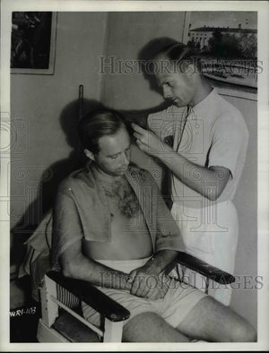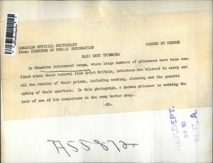 In Canadian internment camps, where large numbers of prisoners have been confined since their removal from Great Britain, internees are allowed to carry out all the routine of their prison, including cooking, cleaning and the general upkeep of their quarters. In this photograph, a German prisoner is cutting the hair of one of his companions in the camp barber shop.