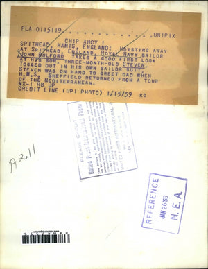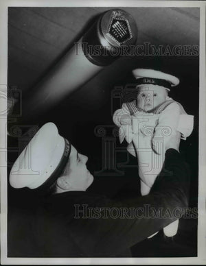 Hoisting away at Spithead, England, Royal Navy Sailor John Bulford, takes a good first look at his son, three-month-old Steven. Togged out in his own sailor suit, Steven was on hand to greet Dad when H M S Sheffield returned from a tour of the Mediterranean.