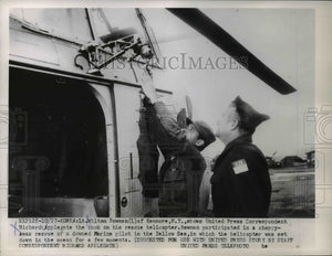 Wilton Bowman of Kenmore, NY shows United Press Correspondent Richard Applegate the hook on his rescue helicopter. Bowman participated in a choppy seas rescue of a downed Marine pilot in the Yellow Sea, in which the helicopter was set down in the ocean for a few moments.