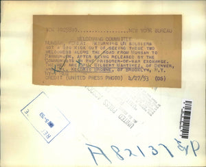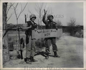 Returning UN Soldiers got a big kick out of seeing these two welcomers along the road from Munsan to Panmunjom, after being released by the communists in the prisoner-of-war exchange. The men are Cpl. Wilbert Martinez, of Denver and CPL. Keldric Browne, of Brooklyn. N.Y.