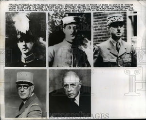 Former Pres. Charles de Gaulle of France is shown in photos at various stages of his life. Top (L to R) : around 1910 as candidate officer; as Captain in 33rd Infantry Regiment around 1915; and as a general in 1940. Bottom Row ( L to R): (L) during Bastille Day Parade 7/18/59 and (R) during a news conference 9/16/68. He died of a heart attack late 11/9 at Colombey_les-Deux- Eglises.