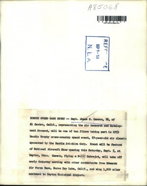 Capt James S Carson, 28, of El Centro, CA, representing the Air Research and Development Command, will be one of 10 fliers taking part in 1953 Bendix Trophy cross-country speed event, 22 year old air classic sponsored by the Bendix Aviation Corp. Event will be the feature of National Aircraft Show at Dayton, Ohio. Carson, flying a F-86F Sabre Jet, will take off with other contestants from Edwards Air Force Base in Muroc Dry Lake, CA, and win 1,900 miles eastward to Dayton Municipal Airport.