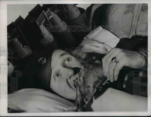 1945 Press Photo Pfc. Frank McKeever munch on a turkey drumstick while on plane