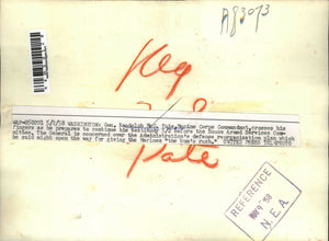 General Randolph McC. Pate Marine Corps Commandant, crosses his fingers as he prepares to continue his testimony 5/2 before the House Armed Services Committee. The General is concerned over the Administration's defense reorganization plan which he said might open the way for giving the Marines "the bum's rush."