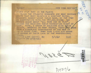 Along the Atlantic seaboard are many defense units that must maintain a constant watch. Soldiers cannot leave their guns, so the Army, in cooperation with the USO, believing the proven adage about all work and no play brings the soldiers their recreation right at camp. Here, a group of soldiers with their guests, imported on Army trucks, toast hot dogs over a fireplace constructed by the men in their spare time. Army cook lifts his hands at their lack of the professional touch.