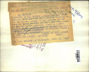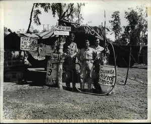 These are the three American Boys who operate a service station in the new Guinea Jungle the authors of the Humorous quips painted on the signed that adorn the makeshift gas station. Left to Right; Corp. Evan J.McPherson of Fresno Calif., Corp. Irving Rosenberg of Texas and Howard R.Divelbiss