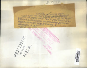 Cadets of the Valley Forge Military Academy graduating class made a tour of inspection at the U.S. Arsenal, and received military instructions on munitions and guns, their contents and manufacture. Photo shows cadets examining shells of all description in the drafting department of the arsenal.