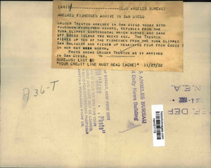 Wrecked Fishermen Arrive In San Diego Cruser Trenton arrived in San Diego today with fourteen fisherman aboard, refugees from the tune clipper Continental which burned and sank off Cocos Island two weeks ago. The Trenton picked up ten of the fishermen from the tuna clipper San Salvador and picked up remaining four from Cocos on her way north. Photo shows Cruser Trenton as it arrived in San Diego.