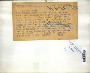 Stopping for the night on a trail through the Naga Hills, American soldiers of a U.S. Army Jungle Outpost meet Mr. M. Murray, a member of the Indian Civil Service. Left to right: Corp Nicholas Lysczo of New York City, Corp. Darrall L. McAfee of Sedan, Kansas; Mr. Murray and Private Raymond Hohn of San Francisco California. The native in the background is Murray's servant.